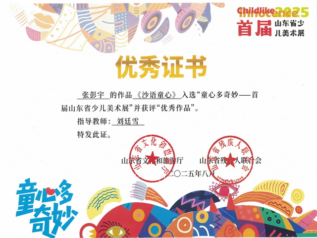 更令人振奋的是,张彭宇同学的《沙语童心》不仅获评“优秀作品”,更是日照市唯一获此殊荣的作品!这份沉甸甸的荣誉,不仅是对学子个人艺术才华的高度认可,更彰显了我校在艺术教育领域的丰硕成果,展现了我校学子卓越的艺术创造力与全面的综合素养。