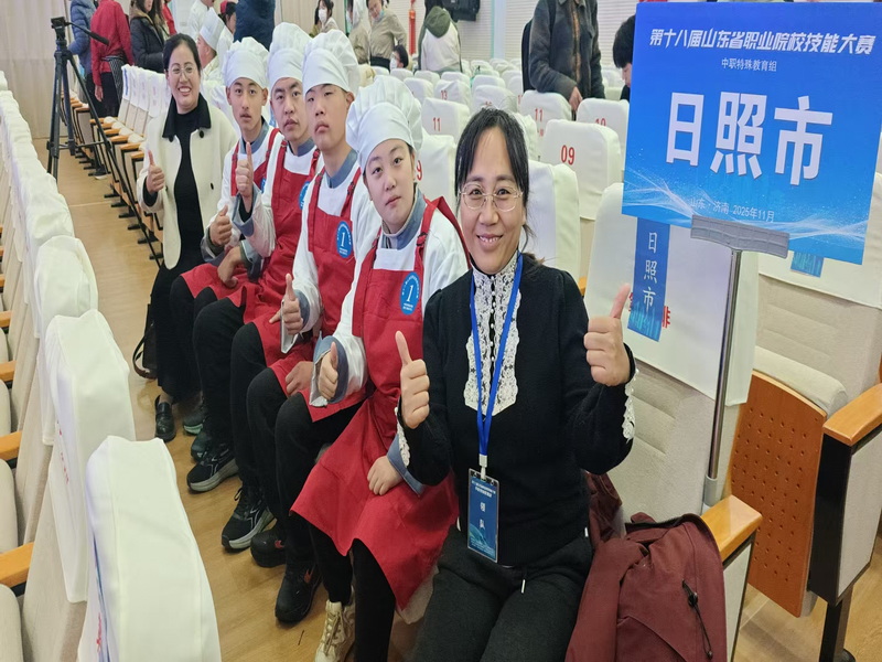 2025年11月30日,我校中职学生潘晓玲、于相世、卢衍臣、徐田福4名同学代表日照市,参加第十八届山东省职业院校技能大赛中职特殊教育组餐饮赛道培智烹饪赛项。本次赛事汇聚全省26支市县级特殊教育学校代表队,我校代表队抽中1号签率先参赛。